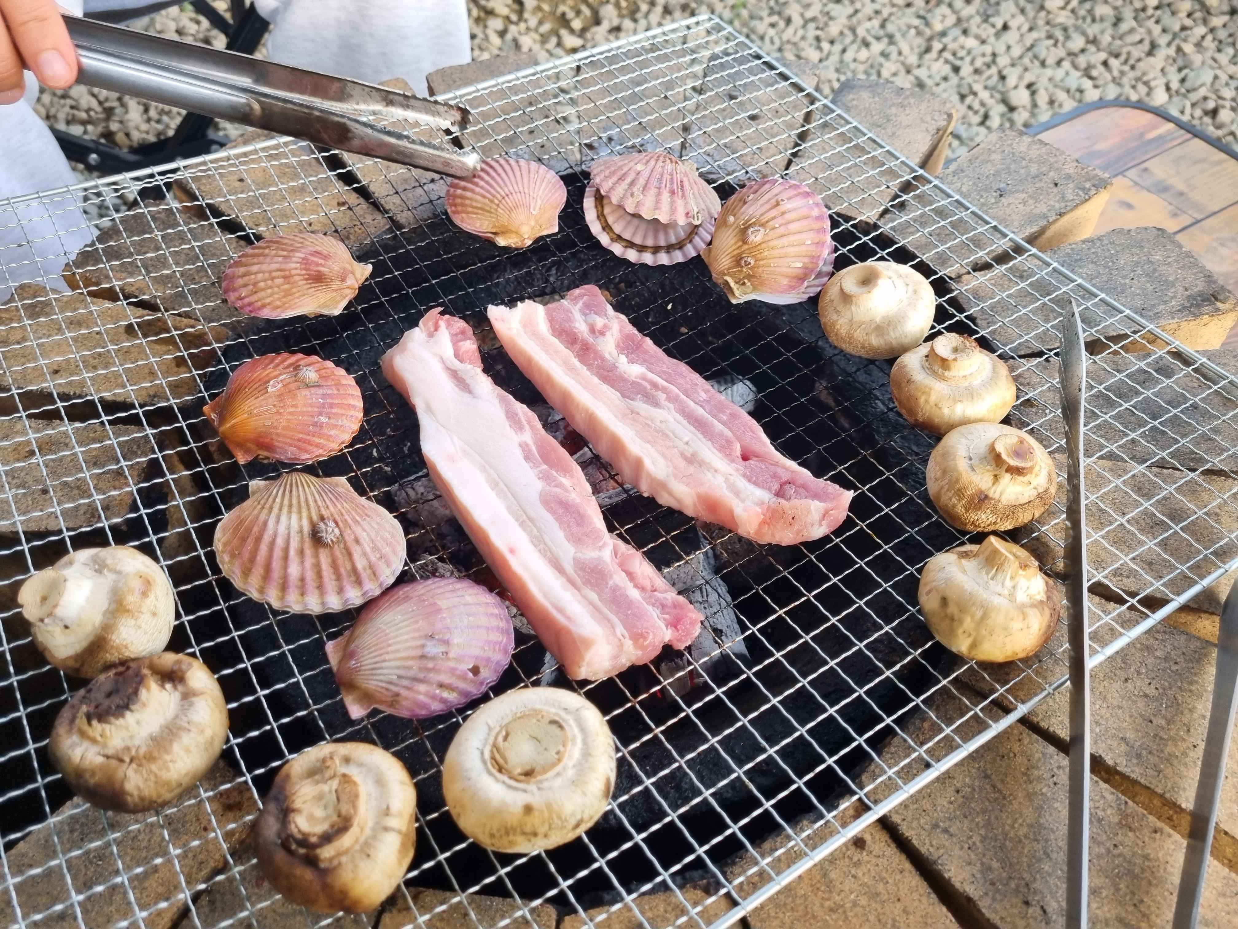 고기뿐만 아니라 가리비도 사 와서 숯불에 조개구이로 먹었어요!