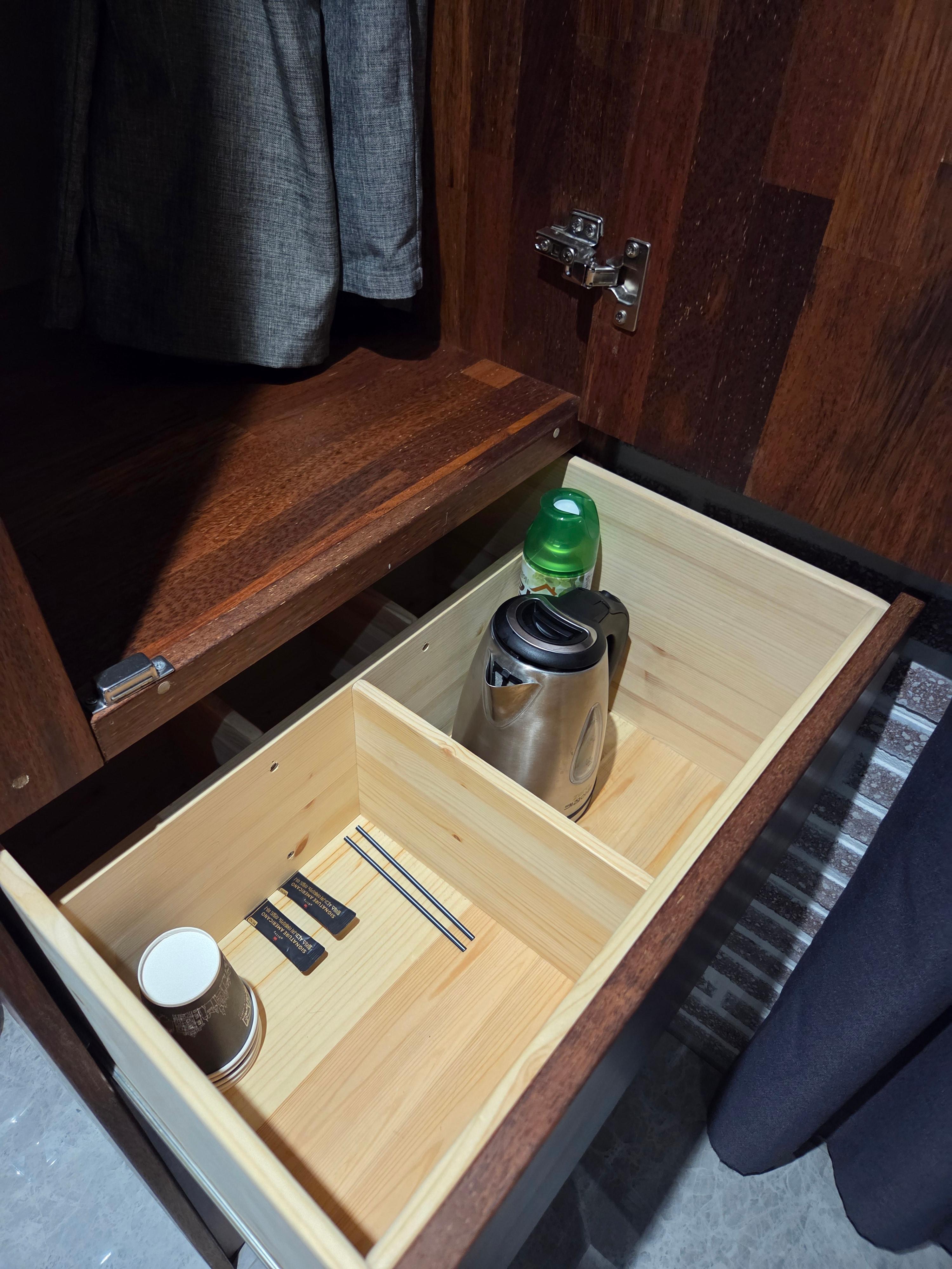 객실 내에는 고데기, 드라이어, 전기포트, 종이컵과 커피, 생수 및 탄산수 등이 기본적으로 제공되어 별도로 준비할 것이 거의 없습니다.