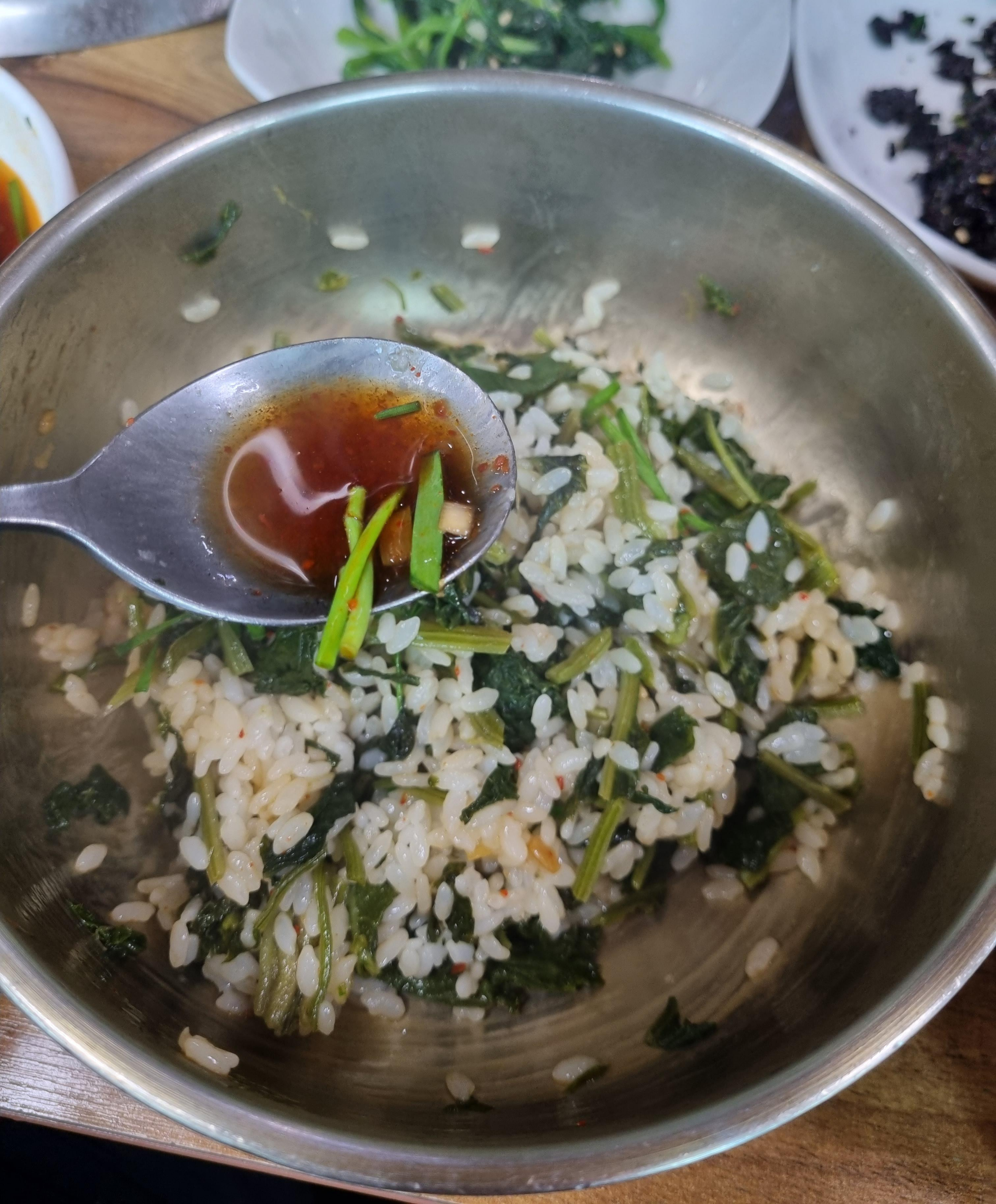 덜어낸 밥에는 반찬과 함께 나온 간장 양념장을 적당히 넣어 비벼줍니다