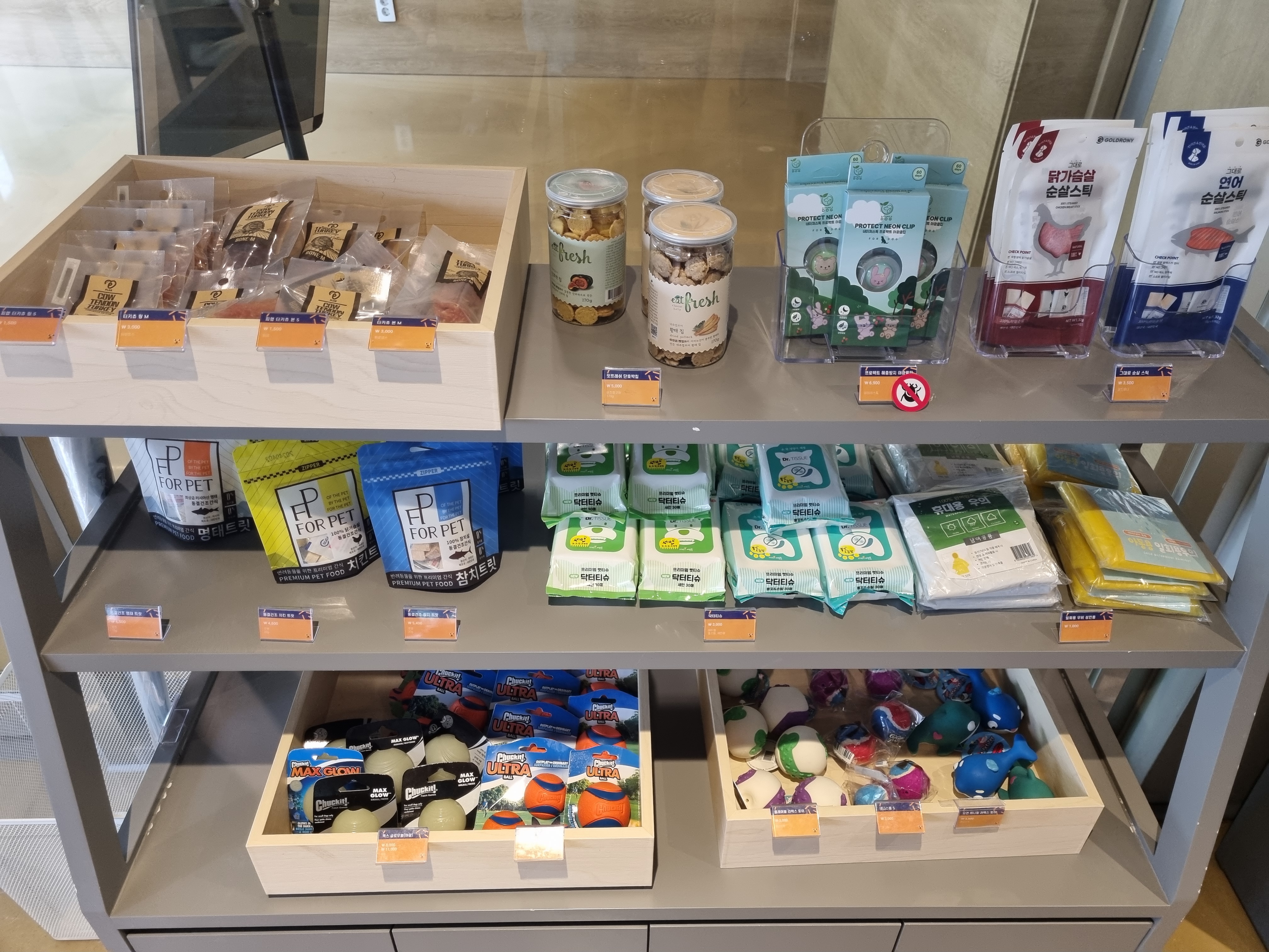 1층에는 강아지 옷, 간식, 사료, 장난감 등 다양한