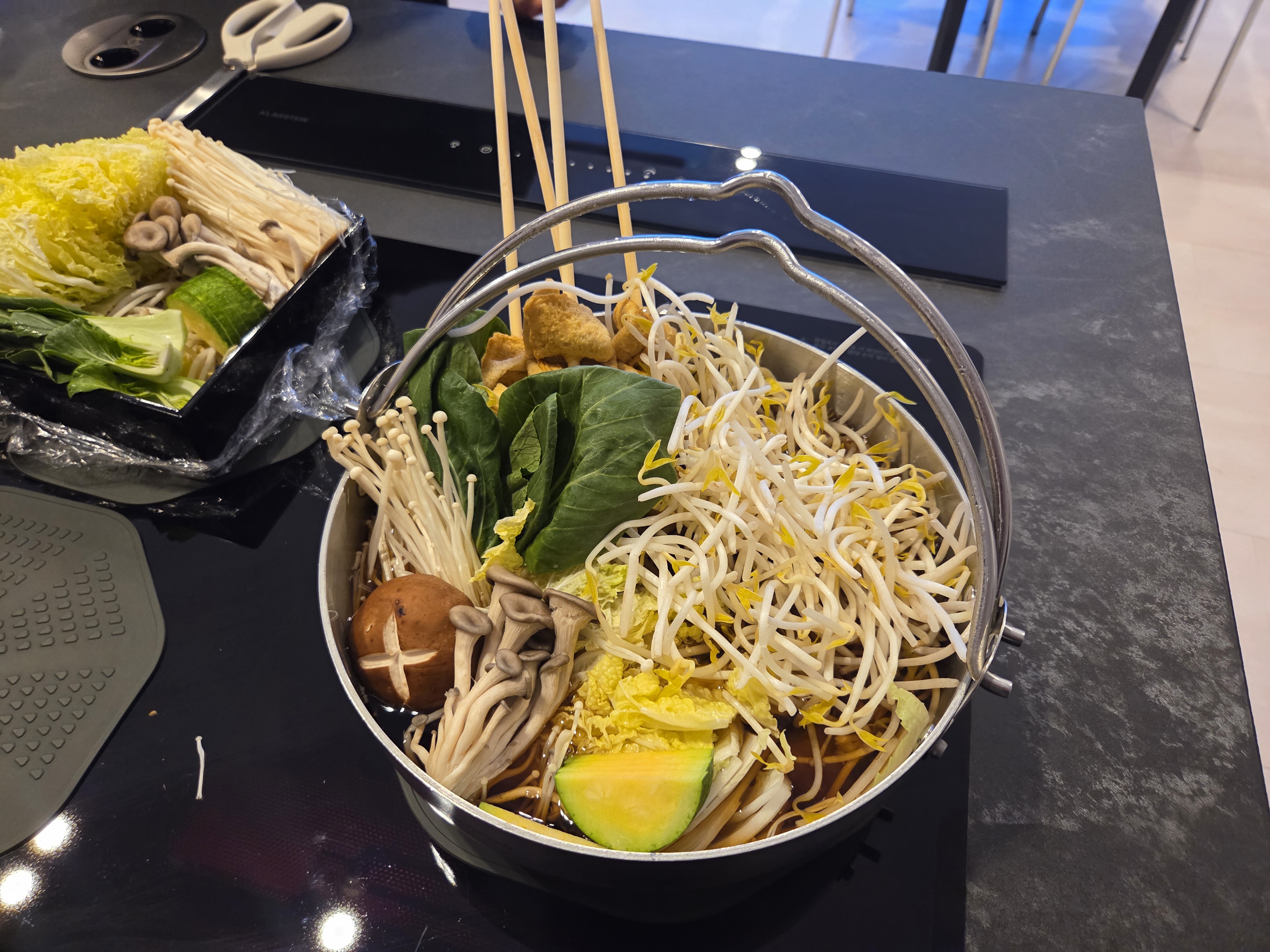 그렇게 먹기는 어려워서 팔팔 끓이고 나서 식탁으로 가져가서 먹었어요