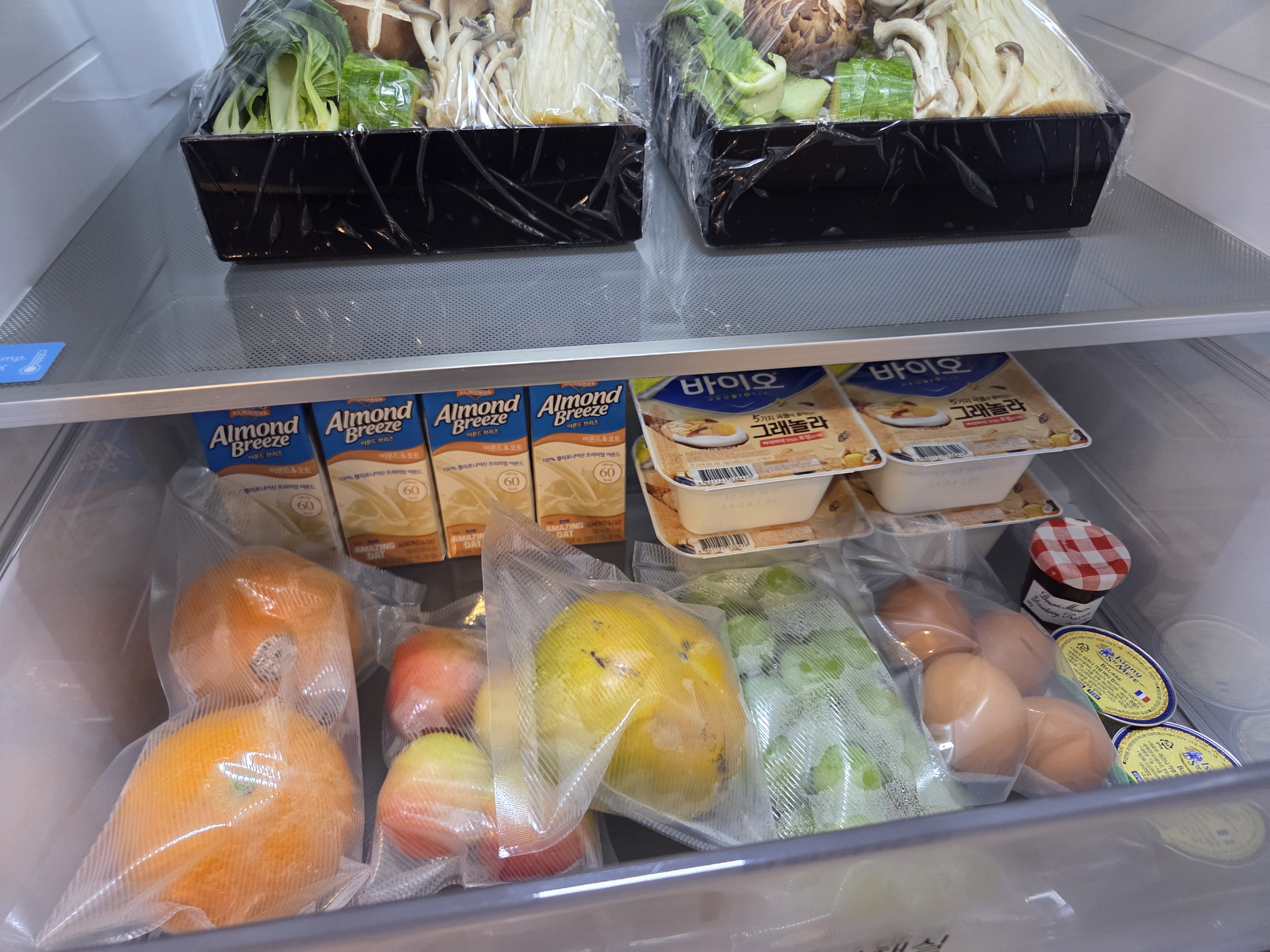 밑에 서랍에도 오렌지, 사과, 감, 샤인머스켓, 계란, 딸기잼, 버터 요거트, 아몬드브리즈까지!