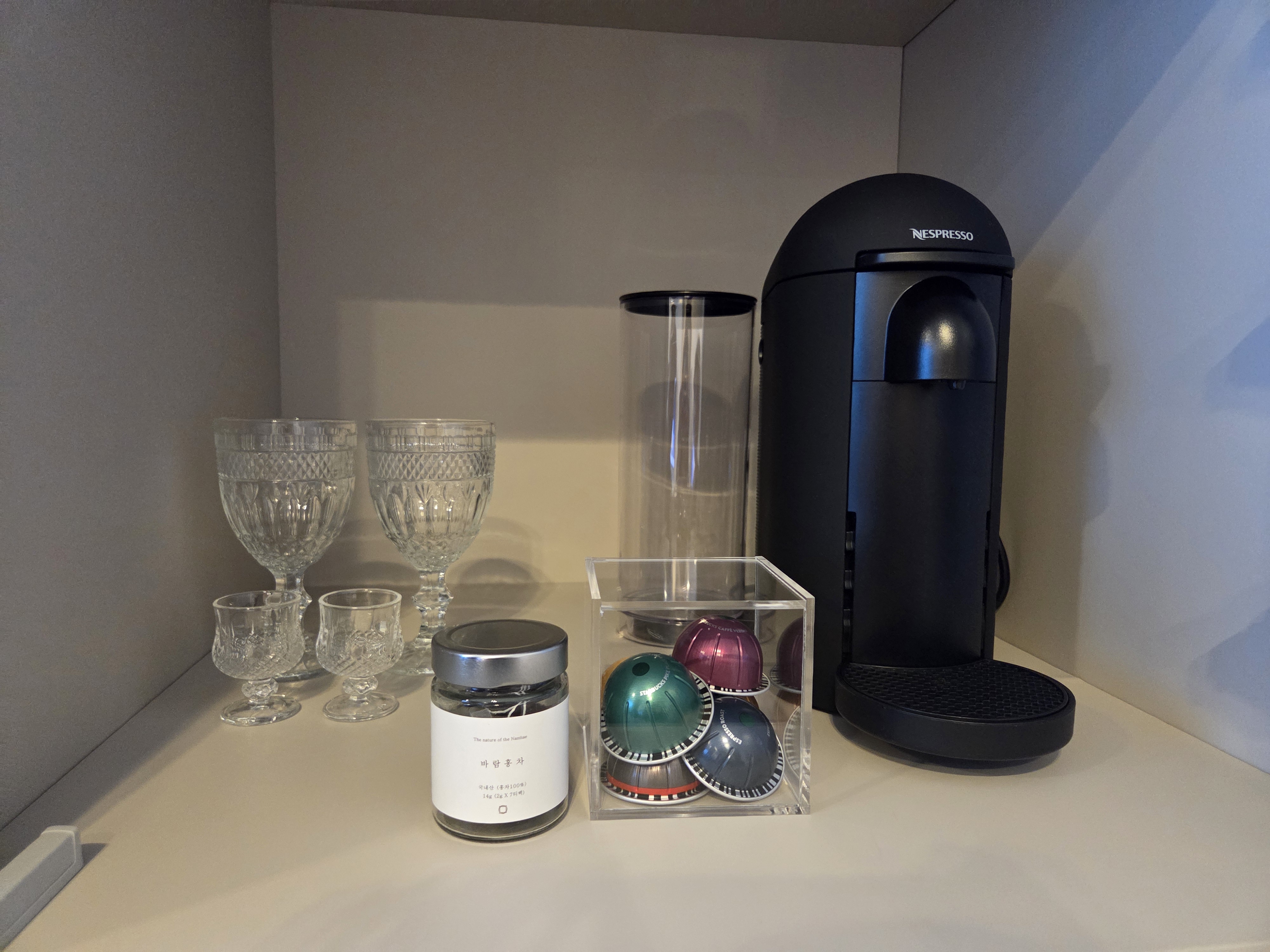 오븐 위쪽에는 커피머신이랑 홍차도 있었어요