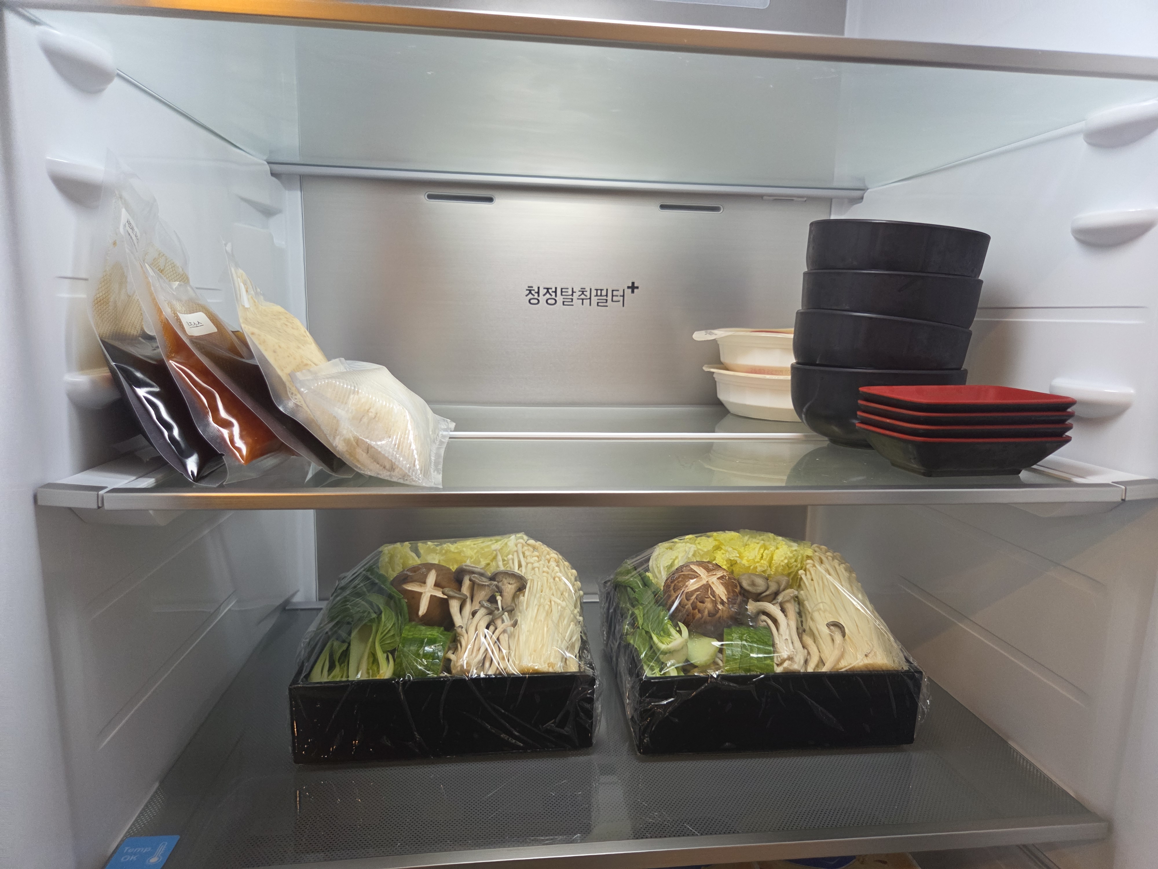 냉장고 안에는 샤브샤브 육수, 소스, 각종 야채와 버섯들, 밥, 그릇까지 준비되어있었고