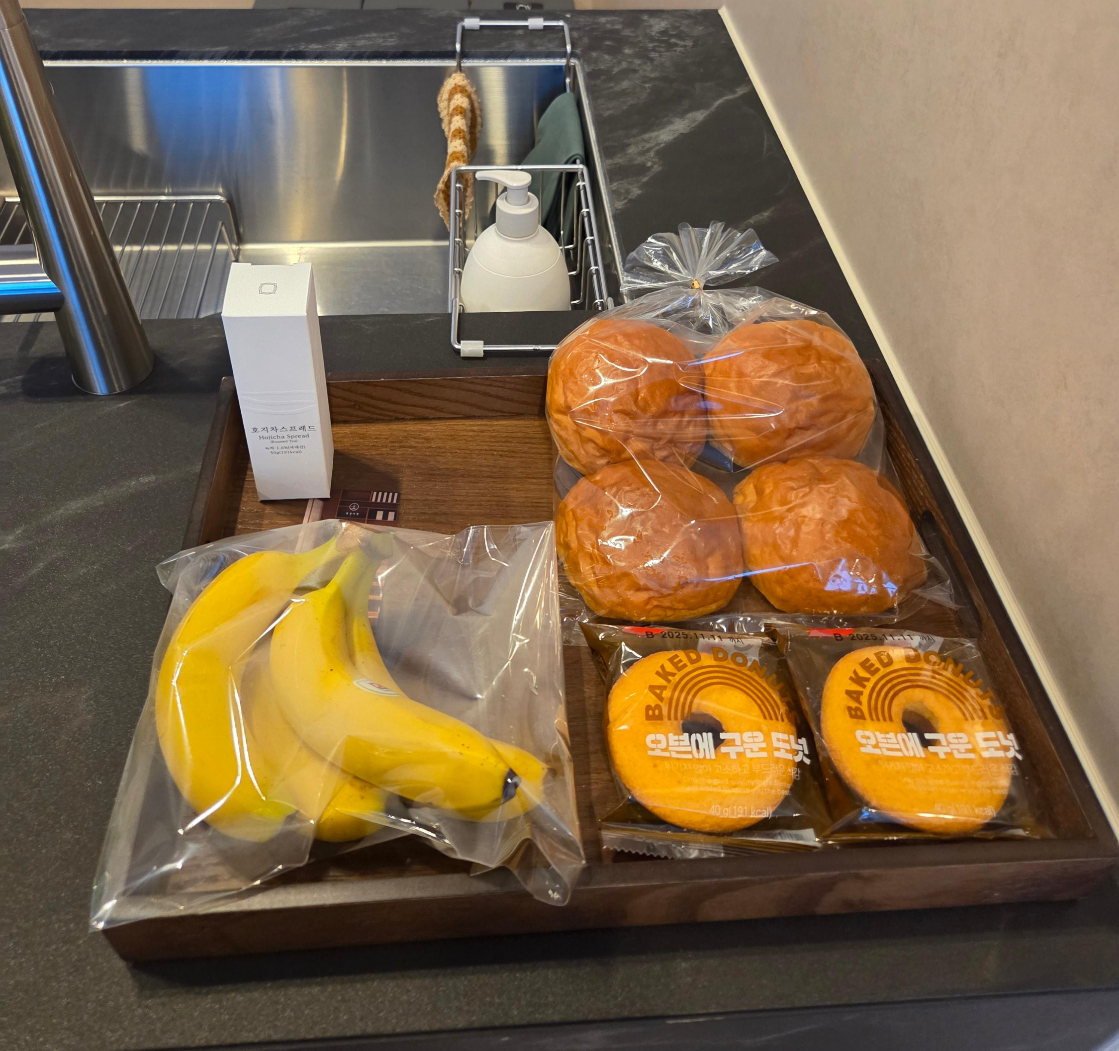 아침 식사용으로 바나나, 모닝빵, 도넛이 있었고, 홍차 스프레드까지 준비되어 있어서 고급진 조식 느낌 뿜뿜