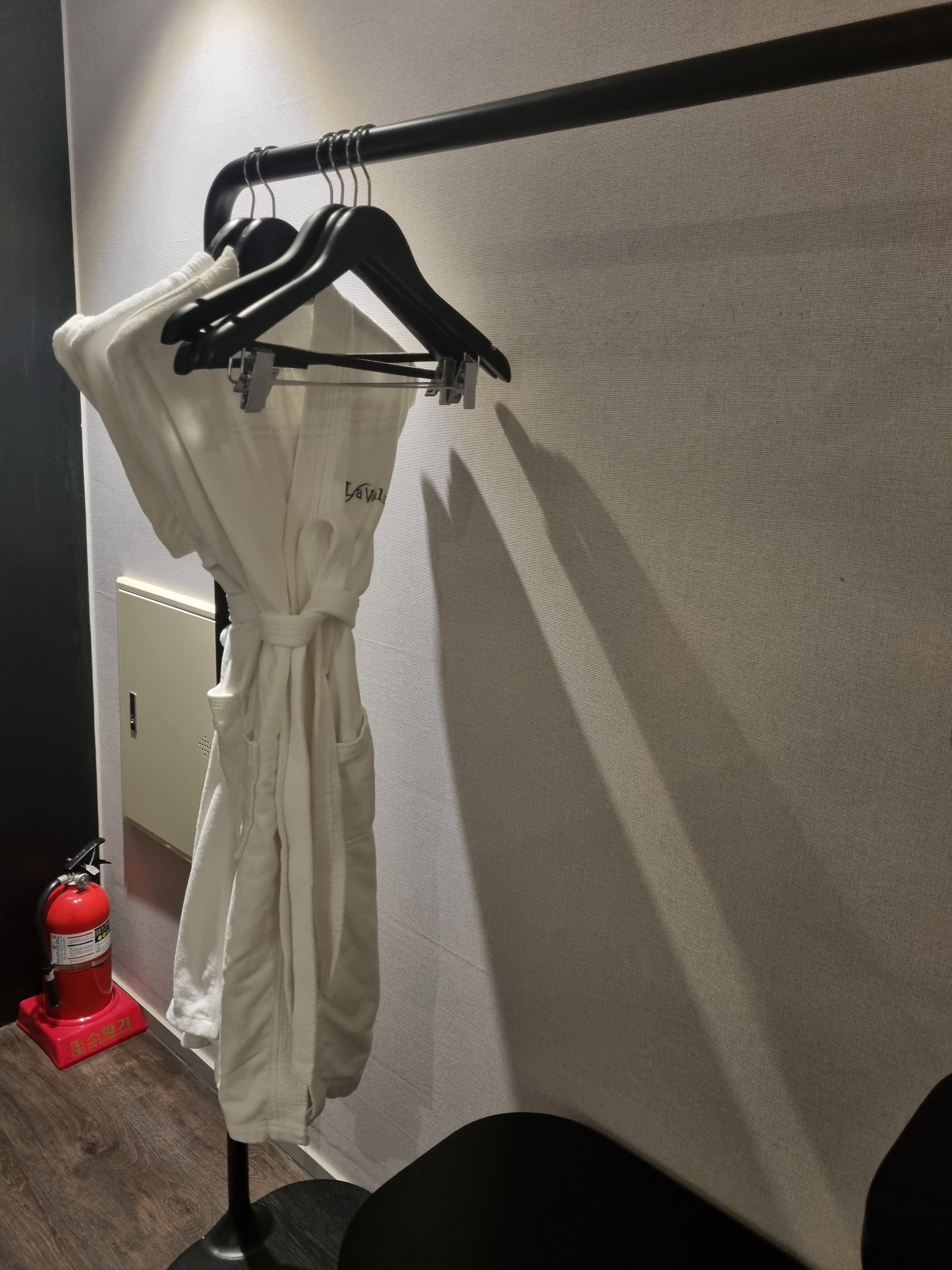 호텔 가운 2개가 옷걸이에 걸려 있고
