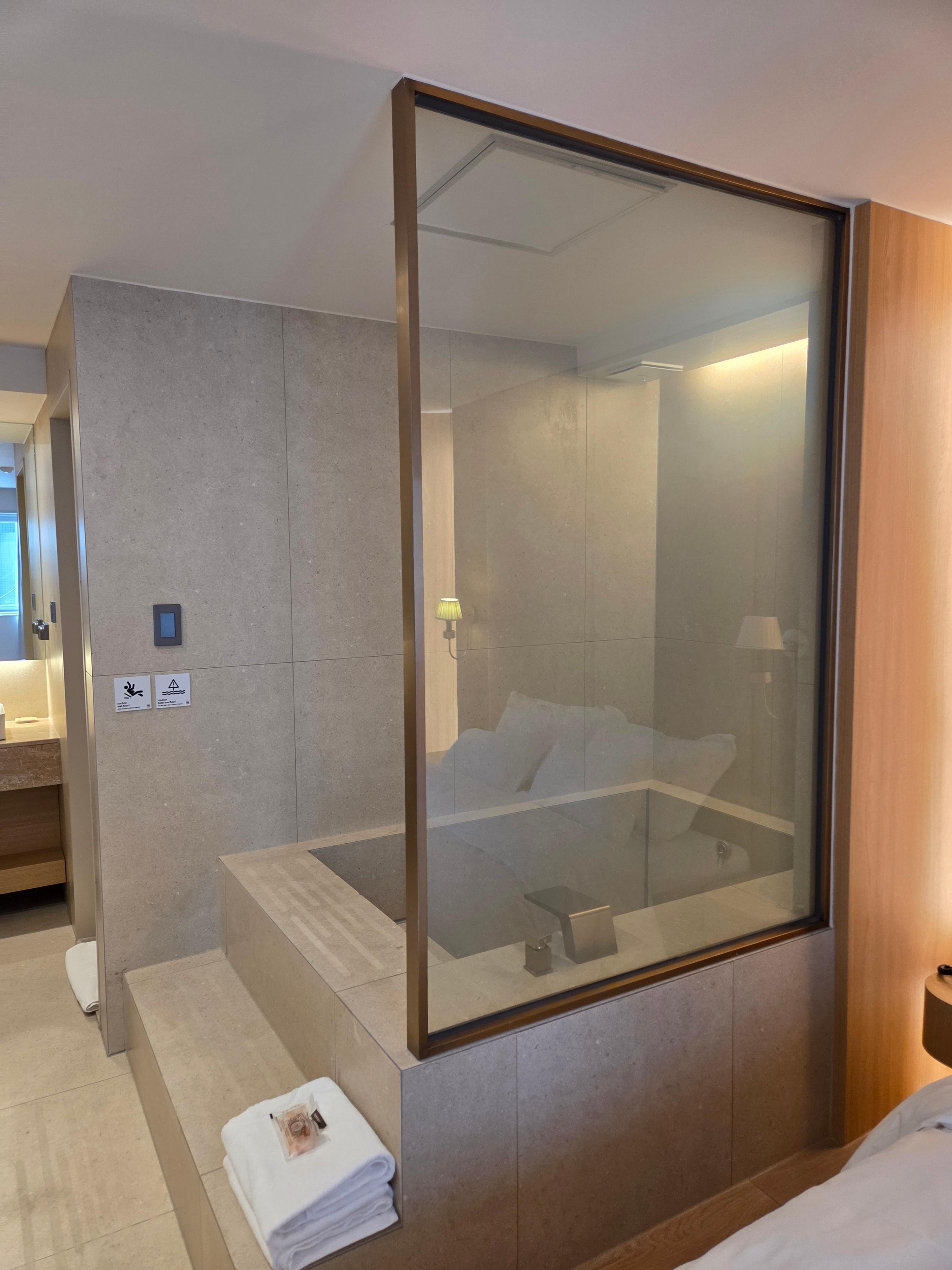 - 욕조 옆 유리창 → 버튼으로 투명/불투명 조절