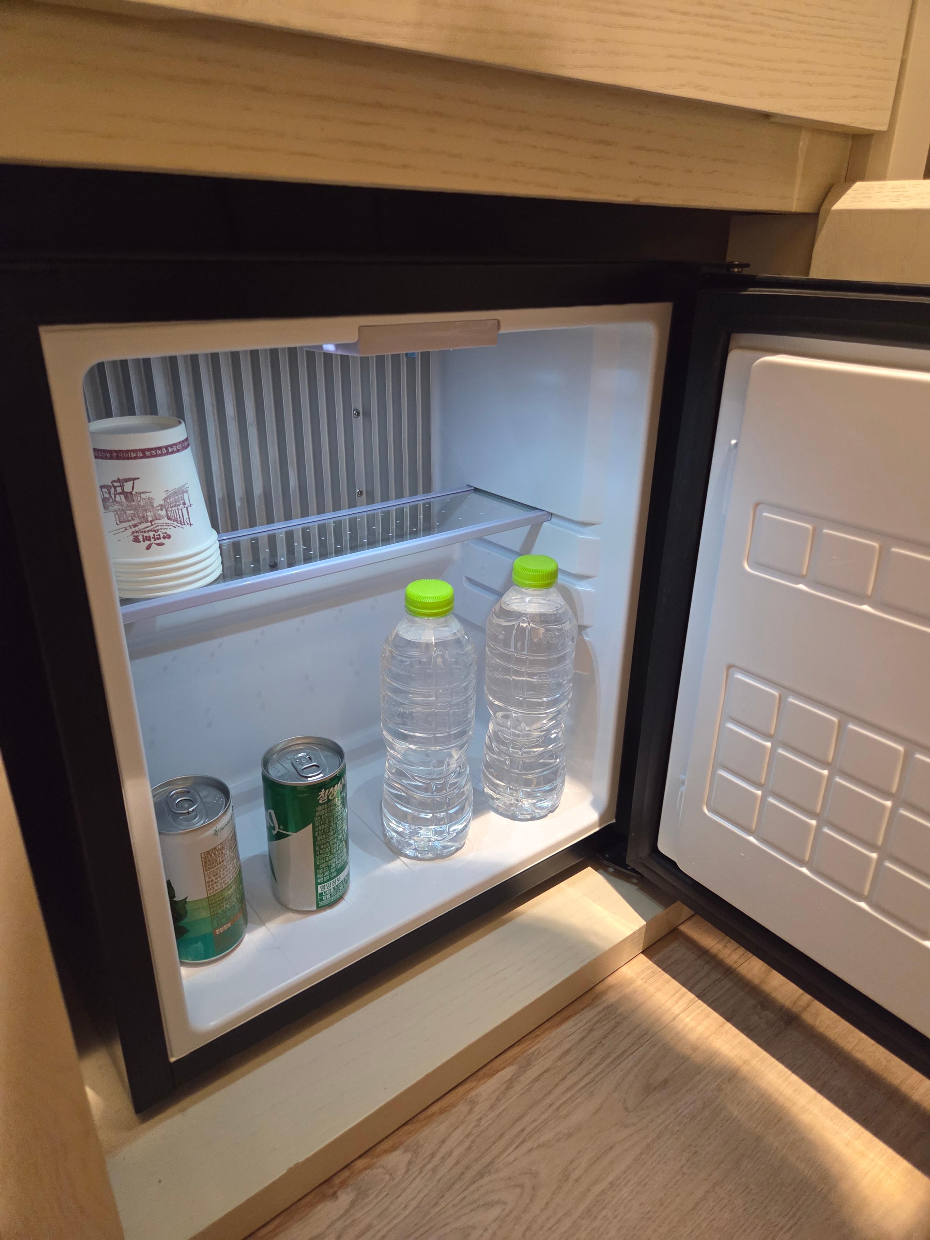 냉장고에는 기본적으로 사이다, 헛개수, 생수 2병이 제공되며, 종이컵도 함께 준비되어 있어 간단하게 이용하기 편리했습니다.
