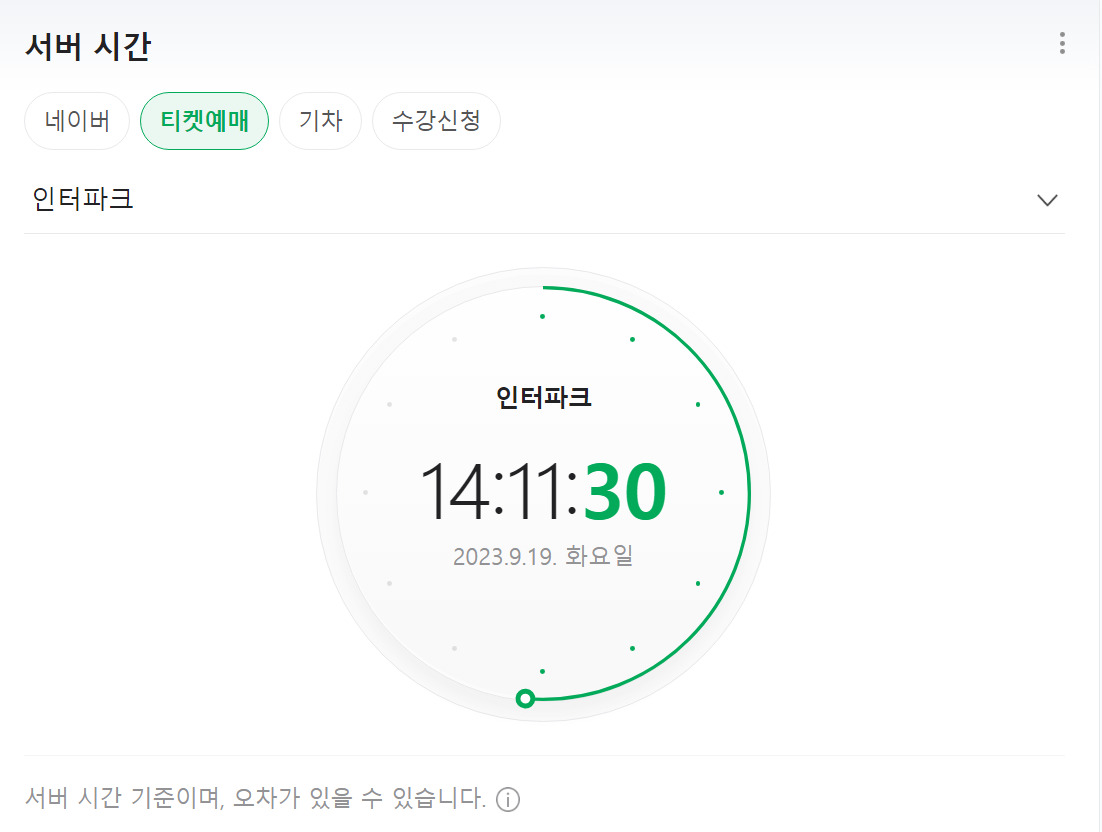 시간 확인을 하기위해서는 '네이버'에서 '티켓팅 시간'이라고 검색을 하면 예매사이트 별로 정확한 서버시간을 알 수 있습니다. 아니면 티켓팅 시 사람들이 많이 사용하는 사이트인 '타임시커'에서도 확인이 가능합니다.